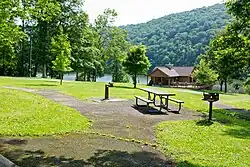 The National Park Service, in cooperation with the Pennsylvania Department of Forests and Waters (today the Pennsylvania Department of Conservation and Natural Resources), employed men of the Works Progress Administration and Civilian Conservation Corps (CCC) to work at Laurel Hill. Men from the first CCC camps arrived on July 1, 1935, and began building their own housing.[3][4][7] These camps were NP-5-PA (first called SP-8-PA)[8][9] and SP-15-PA.[10] Each camp consisted of 200 men who worked year round. They cleared brush from streams, planted trees, and built roads, trails, bridges, and recreational facilities including large group camping facilities, cabins, and picnic areas.[3][4][7] They constructed the dam to create Laurel Hill Lake.[7]