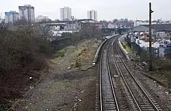 When the railways were nationalised in 1948, Lawrence Hill came under the control of the Western Region of British Railways,[18] which oversaw a gradual decline of services at Lawrence Hill. Passenger numbers along the Clifton Extension Railway, now known as the Severn Beach Line, also dropped, and in 1963 the Beeching report suggested that all services along the line be withdrawn. In the end, services continued to Severn Beach but were discontinued via Henbury and Pilning.[18] Staff were withdrawn from the station from 17 July 1967 as a cost-saving measure.[4][18] The footbridge was demolished by 1970, forcing passengers to change platform via the steps to Church Road at the south end of the station. Most of the station buildings were demolished in August 1970, but there were still some on the westernmost platform in 1979. By 1974 the platforms serving the eastern tracks had been removed, with the tracks themselves removed in 1984.[4] Plans to use the disused trackbed as part of a light rail scheme linking the city centre to the northern suburbs were formed in the late 1990s, with the aim of an operational scheme by 2008, but the plans had been shelved by 2004.[19][20][21] It was suggested in 2008 that the trackbed could be used as a cycle path to join together communities which had been separated by the construction of the M32 motorway, however this was dropped due to Network Rail asserting that the trackbed might be necessary for future rail expansion.[22][23][24]