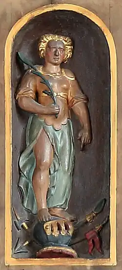 The Layer Quaternity are four marble sculpture figurines approximately 25 centimetres (10 in) in height located on the two columns of the Layer Monument, an early 17th-century polychrome mural monument (320 by 350 centimetres [130 in × 140 in]) which was installed in the Church of Saint John the Baptist, Maddermarket, Norwich to the memory of Christopher Layer (1531–1600).