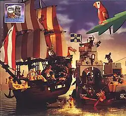 The Pirates were led by Captain Redbeard (called Captain Roger in some markets), distinguished by his black bicorne hat, left eye patch, peg leg on the right and a hook where his left hand was; his crew included First Mate Rummy, Flashfork the cook, and the young Bo'Sun Will. Another pirate leader was Captain Ironhook who has been suggested as a rival to Redbeard; both minifigures were similar except that Ironhook had a tattered shirt (some releases of Ironhook have a peg leg).[6] Their emblem was the Jolly Roger, a black flag featuring the skull and crossbones. 6285 Black Seas Barracuda was their first pirate ship while 6270 Forbidden Island was their original hideout, both released in 1989.[7] The catalogue releases for the Pirates expanded considerably with a larger base, 6273 Rock Island Refuge (1991), and then a pair of pirate ships in 1993 (the large 6286 Skull's Eye Schooner and small 6268 Renegade Runner).