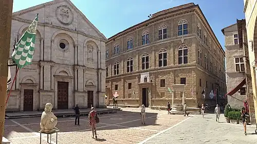 Alberti is considered to have been the consultant for the design of the Piazza Pio II, Pienza. The village, previously called Corsignano, was redesigned beginning around 1459.[19] It was the birthplace of Aeneas Silvius Piccolomini, Pope Pius II, in whose employ Alberti served. Pius II wanted to use the village as a retreat, but needed for it to reflect the dignity of his position.