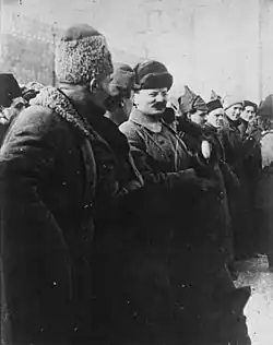 After the success of the October Revolution on 7–8 November 1917, Trotsky led efforts to repel a counter-attack by Cossacks under General Pyotr Krasnov and other troops loyal to the overthrown Provisional Government at Gatchina. Allied with Lenin, he defeated attempts by other Bolshevik Central Committee members (Zinoviev, Kamenev, Rykov, etc.) to share power with other moderate socialist parties. Trotsky advocated for a predominantly Bolshevik government and was reluctant to recall Mensheviks as partners after their voluntary withdrawal from the Congress of Soviets. However, he released several socialist ministers from prison. Neither Trotsky nor his colleagues in 1917 initially wished to suppress these parties entirely; the Bolsheviks reserved vacant seats in the Soviets and the Central Executive Committee for these parties in proportion to their vote share at the Congress.[83] Concurrently, prominent Left Socialist Revolutionaries assumed positions in Lenin's government, leading commissariats such as agriculture (Andrei Kolegayev), property (Vladimir Karelin), justice (Isaac Steinberg), posts and telegraphs (Prosh Proshian), and local government (Vladimir Trutovsky).[84] According to Deutscher, Menshevik and Social Revolutionary demands for a coalition government included disarming Bolshevik detachments and excluding Lenin and Trotsky, which was unacceptable even to moderate Bolshevik negotiators like Kamenev and Sokolnikov.[85] By the end of 1917 Trotsky was unquestionably the second-most-powerful man in the Bolshevik Party after Lenin, overshadowing Zinoviev, who had been Lenin's top lieutenant for the previous decade.