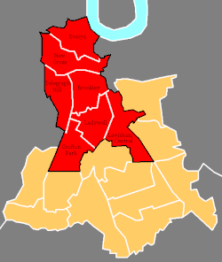 This constituency covered Lewisham's northern tip – a short stretch alongside the Thames – along with the Deptford and New Cross districts, and the centre of Lewisham itself. These are historically some of the more deprived in London with high crime rates and social problems.[4] However, in the 21st century, counter to this, more upmarket housing developments are springing up as former industrial sites are cleared away. To the South East of the seat, Lewisham town centre adjoins Ladywell.