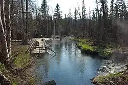 Alpha pool with water temperatures ranging from 42 to 52 °C (108 to 126 °F); There are raised walkways from the parking area to the springs so that the delicate muskeg that forms the swamp is not disturbed. The walkway was the scene of a much-publicized black bear attack that killed two tourists on August 14, 1997.[7]