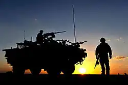 During the Second World War, again forming part of the HCCR, the Life Guards undertook armoured reconnaissance duties in Palestine, Iraq, Iran, Egypt and Italy.[8] In 1944, the Life Guards took part in the Normandy landings and the advance through France to liberate Brussels.[5] In the late 1940s, they were deployed to the Middle East, initially in Egypt, garrisoned at Kasr-el-Nil Barracks in Cairo from 1946 to 1947, and then in Palestine from 1947. In 1948, the unit left the Middle East and returned to England on leave. In 1952, it returned to Germany as part of the 11th Armoured Division.[10]