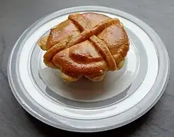 A culinary specialty of Leipzig, it consists of a tart shaped shortcrust pastry filled with marzipan and jam, decorated with two crossed strips of dough. It was originally filled with songbirds, however today it is exclusively made sweet. |