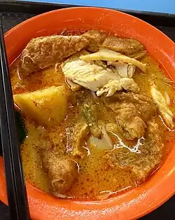 Noodle dish | Usually contains chicken meat and tau pok, and uses curry as soup base coupled with yellow noodles. [5] |