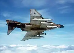 Similar to the XM12/SUU-16/A, this pod featured a self-powered variant of the M61A1, designated XM130 (may have been standardized as the M130) by the US Army and GAU-4/A by the US Air Force. This modification allowed its carriage on aircraft that could not meet the speed requirement of the previous unit, and reduced drag by removing the ram-air turbine requirement. This pod was popular for use on the F-4C and F-4D Phantom II aircraft, as well as British FG.1 and FGR.2 Phantom IIs.[2][14] The pod still has a weight restriction, weighing more than its predecessor at 1,730 lb (780 kg) loaded with 1,200 rounds of ammunition, and still has the fixed rate of 6,000 rpm.[1]