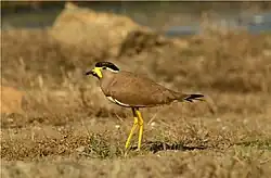 Bustards are large terrestrial birds mainly associated with dry open country and steppes in the Old World. They are omnivorous and nest on the ground. They walk steadily on strong legs and big toes, pecking for food as they go. They have long broad wings with "fingered" wingtips and striking patterns in flight. Many have interesting mating displays.