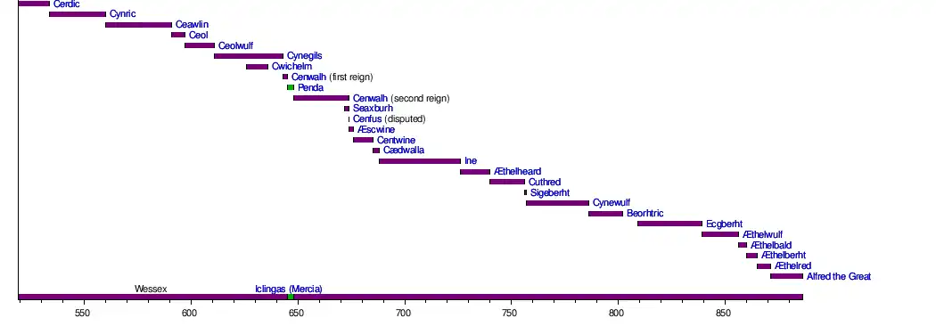 | 757 to 786 | Cynewulf | Assassinated by Cyneheard, who was the brother of Sigeberht. Direct descendant of Cerdic. |