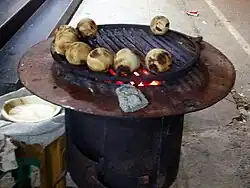 Litti (Bhojpuri: 𑂪𑂲𑂗𑂲 romanized: Leetee) a wholewheat flour dough ball stuffed with a spiced mixture of satui (roasted black chickpea flour).[1] Litti, along with chokha, is a complete meal that is popular in the Indian states of Bihar, and eastern Uttar Pradesh, and the Nepalese provinces of Madhesh and Lumbini (eastern parts).[2] It is also a popular street food in small towns and cities. Over the years it has gained international recognition.[3][4][5]