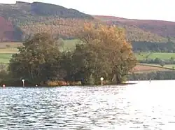 The crannog is a small artificial island about 40 metres (130 ft) from the north shore. It is constructed of massive planks of oak behind which was built a dwelling platform formed from layers of stone, soil and brushwood.[9] It was investigated by archaeologists from the National Museum of Wales between 1989 and 1993. Finds included a high quality textile and a bronze hinge from an 8th–9th century reliquary decorated in a style similar to that seen in Ireland.[10] The 1993 dig was joined by the TV series Time Team and featured in series one, episode four in 1994.[11] In 2005, works were carried out to protect the island from erosion.[10]