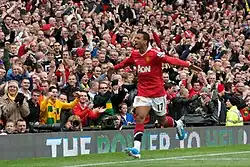 On 26 March, Nani signed a new four-year contract with United, committing himself until 2014.[56] A day later, Nani took his assist tally in the league for the season to nine as he set up two goals in a 0–4 win over Bolton Wanderers at the Reebok Stadium, providing goals for Dimitar Berbatov and Darron Gibson.[57] On 7 April, Nani scored his first ever European goals for United, netting two strikes in a 3–2 victory over Bayern Munich. Despite United winning the match, they were eliminated from the competition due to the away goals rule when the aggregate score was 4–4.[58] On 24 April, Nani scored his first league goal at Old Trafford in 18 months, netting United's second in a 3–1 home victory over Tottenham Hotspur.[59] On 2 May, Nani scored for the second match in a row, netting the only goal in a 0–1 away victory over Sunderland.[60] Nani's third season with Manchester United ended with 34 appearances and seven goals in all competitions.[61]