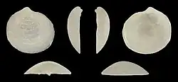 The valves are small and nearly round, about 5 - 10 mm in diameter, the beak is slightly twisted towards the anterior. The lunule is deep and the internal margin slightly crenulated.[3] Deeply inset ligament.