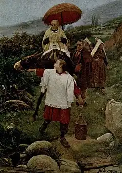 The primary feature of Llauder's writings was Catholicism; some described his editorial activity as secular evangelization and dubbed him "sacerdote de la causa".[133] His religiosity was formatted along fundamentalist lines, based on Manichean vision of the world as a battleground between God and satan.[171] Principal Llauder's foe was liberal Catholicism;[172] campaigns against its embodiment, Alejandro Pidal, were by some dubbed as pidalofobia.[173] Most events were interpreted within chiliastic perspective, either episodes like cholera threat in 1890 and attempt against Martínez Campos in 1893[174] or milestones of Spanish history like the 1898 crisis. The Cuban war was seen as a warning (maybe the final one) to Spain, and the United States was presented as a divine tool, sort of a plague, administered by God to punish the Spaniards for their offences.[175]