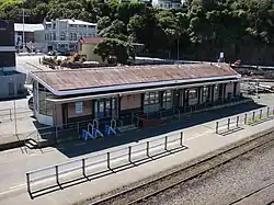The station building was a small wooden structure with a gabled roof, with dimensions of 16 by 35 feet (4.9 by 10.7 m). Trains were worked to the sides of ships for the transfer of cargo by means of wagon turntables, because the tracks in the station yard were at right angles to the wharves.[4] Access to the goods shed was provided by means of a traverser.[5]