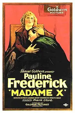 Madame X is a 1920 American silent melodrama film[1] directed by Frank Lloyd and starring Pauline Frederick. The film is based on the 1908 play Madame X, by French playwright Alexandre Bisson, and was adapted for the screen by J.E. Nash and Frank Lloyd.[2] A copy of this film survives in the George Eastman House Motion Picture Collection.[3]