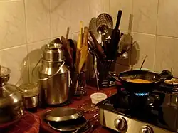 Milk is important as a staple food.[22] Both cow milk and water buffalo milk are popular. Milk is used mainly for drinking, to add to tea or coffee or to make homemade dahi (yogurt). Traditionally, yogurt is made every day using previous day's yogurt as the starting bacterial culture to ferment the milk. The Dahi is used as dressing for many salad or koshimbir dishes, to prepare Kadhi, to prepare cultured buttermilk (Taak) or as a side dish in a thali.[23] Buttermilk is used in a drink called mattha by mixing it with spices.[24] It may also be used in curry preparations.[25] Milk is also the prerequisite ingredient for butter and Ghee (clarified butter).