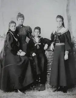 Mercedes was heiress presumptive at birth, but the disappointment was so great that she was initially treated only as an infanta. Antonio Cánovas del Castillo, then head of the government, who disliked Maria Christina and did not want the crown to pass again to a female after the disastrous reign of Isabella II, decided to ignore the newborn.[3] Mercedes's paternal aunt Isabella retained the title of Princess of Asturias until Práxedes Mateo Sagasta, President of the government replacing Cánovas, pressured King Alfonso XII to accord the title to Mercedes, which he did on 10 March 1881.[4] On 12 November 1882, Mercedes gained a sister, Infanta Maria Teresa. The marriage of their parents was unhappy. Alfonso had married Maria Christina in order to secure the succession to the throne. He did not love his wife and was disappointed after she gave birth to two daughters, while he already had two extramarital sons. In July 1883, Maria Christina left the Spanish court and traveled with her daughters to visit her own family in Austria.