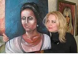 ![]() Artist Mariia Dilai with her portrait of Solomiya Krushelnytska | |