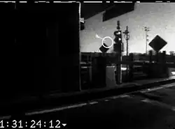 American Airlines Flight 587, circled in white, can briefly be seen in this video still moving downward with a white streak behind the aircraft. This video, released by the NTSB, was recorded by a toll-booth camera located on the bridge.