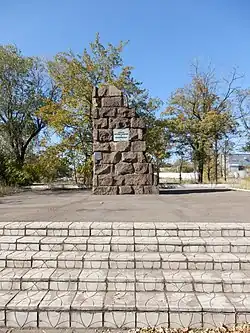 The "Menorah memorial", or officially, the Mariupol Memorial to the Murdered Jews[40] is installed in a suburb of Mariupol in memory to the murdered Jews of the city.[41][42] The work consists of a seven-pointed menorah, a Star of David and two commemorative steles with inscriptions in Russian:[40][43]