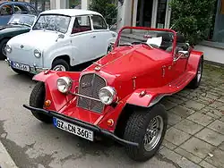 The Roadster was the original car and was based around components from the Triumph Herald range (which included the Spitfire, Herald, Vitesse and GT6). The two-seat body, built of aluminium and glass fibre, had a radiator grille slightly similar to pre-war Alfa Romeo sports cars. As standard, any of Triumph's 4- or 6-cylinder engines of the time could be fitted (1147-2498cc), along with overdrive or non-overdrive gearboxes. In 1981, the Morris Marina became the donor car, replacing the Triumph; the Marina engine became standard, although many customers fitted engines, gearboxes and back axles of their own choice. Fitted with the two-litre inline-six from a late Triumph Vitesse, a top speed of 177 km/h (110 mph) was achievable.[5]