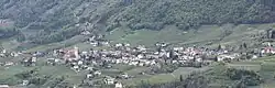 The shield is argent a fess azure and a gules rampant lion. These are the arms of the Lords of Marling who lived in two castles in the village until 1426. The emblem was adopted in 1966. [4]