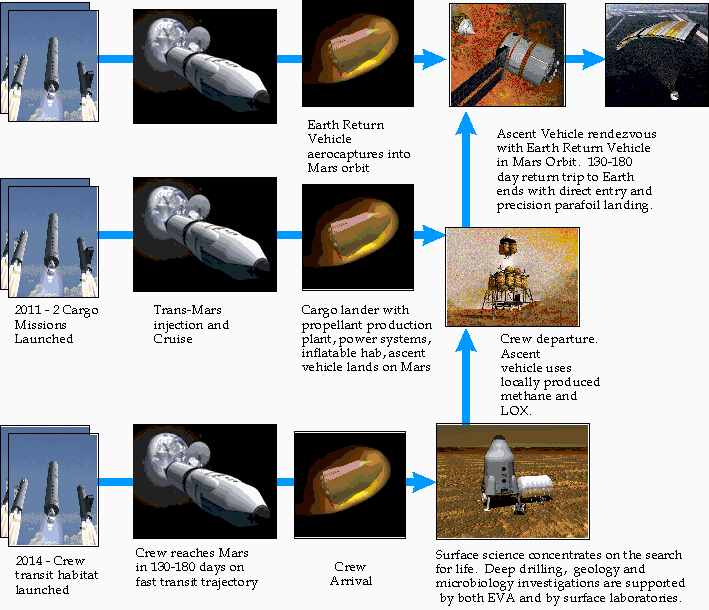 From the work of the original Reference Mission (Version 1.0), the strategy for the human exploration of Mars has evolved from its original form to one of reduced system mass, use of a smaller, more reasonable launch vehicle, and use of more current technology. The steps which have been taken by the Exploration Team are motivated by the need to reduce the mass of the payload delivery flights, as well as the overall mission cost, without introducing additional mission risk. By eliminating the need for a large heavy-lift launch vehicle and deleting the redundant habitat delivery flight in Version 3.0, two launches from the Earth were eliminated. The net result is a current Version 3.0 Reference Mission which requires an injected mass of approximately one-half that of the 1993/94 Reference Mission."[12]