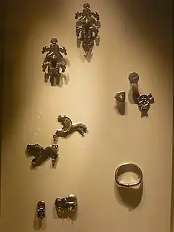 The hoard includes four anthropomorphic silver figurines of 'dancing men' (Ukrainian newspapers sometimes refer to them as 'aliens' for their unusual appearance[3]), five animal figurines, three fibulas, a radiate-head brooch, six armlets, tiaras, ear rings, neck rings, buckles, belt-fittings and horse harnesses. The style of figurines is sometimes considered as influenced by Huns, Bulgars or Avars.[4]