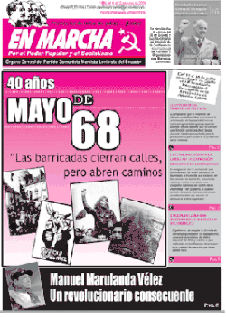 A 2008 issue of En Marcha. In the top right corner, a photo of Enver Hoxha shows the party's ideological orientation. This issue's main article is about May 1968.