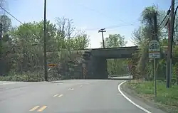 MD 28 originally followed Baltimore Road between downtown Rockville and east of Rock Creek.[11] Between 1940 and 1944, MD 28 was placed on a new grade-separated crossing of the Metropolitan Branch along Veirs Mill Road, then north on First Street to Baltimore Road.[12] MD 28 was rolled back from Ashton to Norbeck between 1944 and 1946.[8] In 1969 or 1970, the controlled access portion of US 15 north of Point of Rocks was completed.[13][6] As a result, MD 85 was assigned to the old route of US 15 north of Tuscarora and MD 28 was extended west to its current terminus in Point of Rocks.[6] Also in 1970, the bypass of Baltimore Road in eastern Rockville was under construction.[13][6] In 1981, MD 28 was made a divided highway between downtown Rockville and Baltimore Avenue west of Rock Creek.[14] In 1982, the divided highway was extended from Baltimore Avenue east of Rock Creek to MD 97.[15]