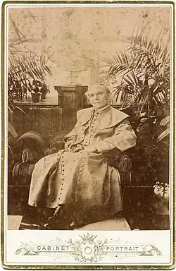 Paliulionis became canon of the Samogitian cathedral chapter in 1875 and procurator of the seminary in 1880.[2] After the death of bishop Motiejus Valančius, Tsarist authorities delayed in approving a new bishop, as Aleksander Kazimierz Bereśniewicz was only serving as apostolic administrator for the Diocese.[8] Paliulionis was appointed bishop of Samogitia on 15 March 1883,[9] in the hopes that he would be loyal to Russia.[10] He was consecrated on 3 June [O.S. 22 May] 1883 by Szymon Marcin Kozłowski, bishop of Lutsk and Zytomierz, assisted by Kazimierz Józef Wnorowski, bishop of Lublin, and Józef Hollak, titular bishop of Arad.[11]