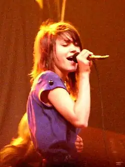 Dia Leif Frampton[32] (born October 2, 1987) was the lead singer of the band. She attended Dixie High School in St. George, Utah and Shadow Ridge High School in Las Vegas, Nevada; she graduated early by also homeschooling her senior year at the same time attending public school for her junior year in 2005 then moved to Salt Lake City with her sister to further their music career. She cites as influences Modest Mouse, Tom Petty and the Heartbreakers, Joni Mitchell, The Avett Brothers, Rocky Votolato, Ben Folds, Etta James, Death Cab for Cutie, The Cranberries, and Cursive.[33] During live performances, Dia plays percussion instruments, such as the cowbell and tambourine, and occasionally a Casio Privia keyboard. She almost always performs without shoes on. She also does not like to eat anything within two hours of performing. Dia often recorded a "song diary," an impromptu recorded song, on her MySpace page. She explained, "It was something very raw, and to be honest, something that I was slightly embarrassed to put up because of the quality but I did anyways, for any of our listeners who would care to hear something not hot off the production belt, but something more organic and 'home made.' It made me feel better to share my feelings with people who could connect, and I think that is what happened with many."[34]