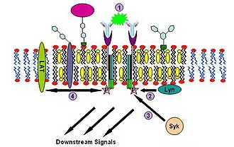 This signaling pathway can be described as follows: IgE first binds to Fc-epsilon receptors (FcεR) residing in the plasma membrane of mast cells and basophils through its Fc segment. FcεR is a tetramer consist of one α, one β and two γ chains.[42] It is monomeric and binds one IgE molecule. The α chain binds IgE and the other three chains contain immune receptor tyrosine-based activation motifs (ITAM). Then oligomeric antigens bind to receptor-bound IgE to crosslink two or more of these receptors. This crosslinking then recruits doubly acylated non-receptor Src-like tyrosine kinase Lyn to phosphorylate ITAMs. After that, Syk family tyrosine kinases bind these phosphotyrosine residues of ITAMs to initiate the signaling cascade.[40][41] Syk can, in turn, activate other proteins such as LAT. Through crosslinking, LAT can recruit other proteins into the raft and further amplify the signal.[46]