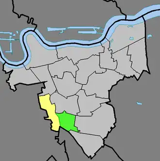 Middle Park (green) within the ward of Middle Park and Sutcliffe (yellow) in the Royal Borough of Greenwich (light grey)