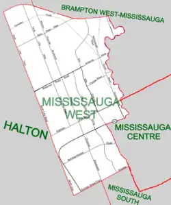 Mississauga West consisted of the part of the City of Mississauga lying of north of Dundas Street West west of the Credit River, north of the Queen Elizabeth Way, and west of Hurontario Street. It was re-defined in 1996.
