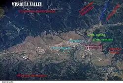 Around 13,000 years ago, the entire valley was at the bottom of Glacial Lake Missoula. As could be expected for a former lake bottom, the layout of Missoula is relatively flat and surrounded by steep hills. Evidence of the city of Missoula's lake-bottom past can be seen in the form of ancient horizontal wave-cut shorelines on nearby Mount Sentinel and Mount Jumbo.[44] At the location of present-day University of Montana, the lake once had a depth of 950 feet (290 m).[45] The Clark Fork River enters the Missoula Valley from the east through Hellgate Canyon after joining the Blackfoot River 5 miles (8 km) east of downtown, at the site of the former Milltown Dam. The Bitterroot River and multiple smaller tributaries join the Clark Fork on the western edge of Missoula. The city also sits at the convergence of five mountain ranges: the Bitterroot Mountains, Sapphire Range, Garnet Range, Rattlesnake Mountains, and the Reservation Divide, and thus is often described as being the "hub of five valleys".[7]