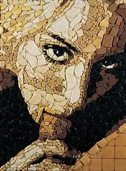 Other media they have used for portraits include cotton thread for a series including Rodolfo Enrique Fogwill,[4] pearls for María Amalia Lacroze de Fortabat, matches for the gallery owner Ruth Benzacar,[9] dried meat for Lucian Freud,[4] burnt toast, stale bread and resin for Eva Perón, gold chains wrapped around nails for Diego Maradona and bullets and red resin for Che Guevara. Non-portrait subjects include a U.S. dollar note created with 80,000 nails, silver thread and resin on black wood,[11] a lotus flower rendered in 300,000 hand-painted Chinese sticks and a depiction of childbirth as a mosaic of glass squares.[2] They frequently use edibles, such as smoked ham, salmon and cheese, freeze-dried and sealed in resin.[2] For the Black Series, they transformed pornographic images from the internet into mosaics of cookies and crackers in shades of brown and black;[2][7] the monochromy and the use of common foodstuffs are a commentary on the de-eroticisation of sex and its pervasive commodification.[8] In 2012 they showed a triptych reminiscent of Catholic altarpieces, but depicting a favela.[5]