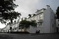 Ten pairs of "delightful" semi-detached villas, five on each side of the road, make up this mid-1840s development by Amon Henry Wilds.[37][116] They are in the Italianate style with influences of Regency architecture, and have two bow windows with bonnet-style canopies above, stuccoed walls with extensive rustication, prominently bracketed eaves and cast iron balconies.[37][116] The "charming" houses are set in spacious plots in a former bluebell wood.[37][65] The street was completed over the course of three years from about 1845.[65] All of the villas are listed buildings.[37]