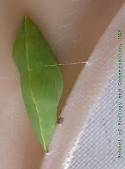 Larva: "Long, somewhat depressed, rough, green, with a white lateral line and above it a black line more or less conspicuous, formed by minute black shining tubercles. In short, this larva in very like a big specimen of a Eurema hecabe".[3]