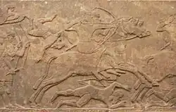 Early horse archery, depicted on the Assyrian carvings, involved two riders, one controlling both horses while the second shot.[38] Heavy horse archers first appeared in the Assyrian army in the 7th century BC after abandoning chariot warfare and formed a link between light skirmishing cavalrymen and heavy cataphract cavalry.[39][40][41] The heavy horse archers usually had mail or lamellar armor and helmets, and sometimes even their horses were armored.[42]
