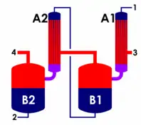 In chemical engineering, a multiple-effect evaporator is an apparatus for efficiently using the heat from steam to evaporate water.[1] Water is boiled in a sequence of vessels, each held at a lower pressure than the last. Because the boiling temperature of water decreases as pressure decreases, the vapor boiled off in one vessel can be used to heat the next, and only the first vessel (at the highest pressure) requires an external source of heat. The multiple-effect evaporator was invented by the American (Louisiana Creole) engineer Norbert Rillieux. Although he may have designed the apparatus during the 1820s and constructed a prototype in 1834, he did not build the first industrially practical evaporator until 1845. Originally designed for concentrating sugar in sugar cane juice, it has since become widely used in all industrial applications where large volumes of water must be evaporated, such as salt production and water desalination.