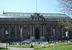 The façade is decorated with sculptures by Paul Amlehn: an allegory of the arts, depicting painting, sculpture, drawing and architecture, is mounted on the triangular gable above the entrance, and two more allegories, of archaeology and applied art, can be seen in the left- and right-hand corners of the building respectively. The upper frieze includes the names of Genevan artists: Dassier, Baud-Bovy, Saint-Ours, Agasse, Töpffer, Liotard, Calame, Diday, Menn, Petitot, Arlaud and Pradier.[2]