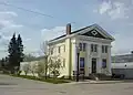 Most National Historic Sites are marked by a federal plaque bearing Canada's Coat of Arms.[43] In earlier years, these plaques were erected on purpose-built cairns,[9] and in later years have been attached to buildings or free-standing posts. These maroon and gold markers are typically in English and French, though some are trilingual where another language is relevant to the subject being commemorated.[44]