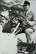 President Suharto and Mrs. Tien Suharto inaugurated the National Monument behind them, the Governor of DKI Jakarta Ali Sadikin and his wife