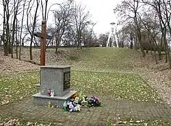 In August 1944, with the Red Army approcahing, a special German unit quartered near the place of execution burned the bodies of the victims for two days and two nights.[20] After the war, the execution site revealed ashes of the murdered, bone fragments, buttons, belt buckles, etc. A monument has been erected at the execution place to honor the victims.[21]