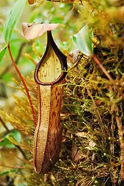 Rosette and lower pitchers are either infundibular in the lower third to half and ovoid above, or ovoid throughout. They reach 25 cm in height and 9 cm in width. A pair of fringed wings (≤15 mm wide) runs down the front of the pitcher. The glandular region covers the lower third to half of the inner surface. The glands are overarched and occur at a density of 400 to 1,300 per square centimetre.[2] The pitcher mouth is round and elongated into a wide neck. The peristome is flattened, expanded, and up to 40 mm wide. A series of teeth (≤7 mm wide) line its inner margin. The peristome ribs are spaced 0.5 to 1.5 mm apart. Pitchers bear 14 to 18 longitudinal nerves across their height.[2] The pitcher lid is ovate and usually has a hook-shaped appendage on the underside near the peristome. A branched spur (≤5 mm long) is inserted near the base of the lid.[8]