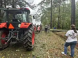 In the early morning of September 28, 2024, Hurricane Helene swept through the town of Ninety Six, taking trees and power lines with it, alongside damaging over 350 houses.[58][59] Many citizens of the town, especially those in more remote areas were trapped in their communities due to the vast amount of trees that had fallen on roads.[60] Many residents took it upon themselves to clear roads, using their own equipment and power tools to cut trees, allowing some to be able to leave their residences via automobile.[61] However, as citizens drove around, many rushed to nearby gas stations to fuel their vehicles, causing havoc,[62] with numerous fights breaking out.[63][64] The National Guard was deployed[65] to assist with the recovery efforts, and many troops were stationed at local gas stations.[66] For the next week, Ninety Six residents were left without power, with many soely relying on backup generators, adding to the need for fuel.[67] Citizens were eager to share what happened, with many needing to file insurance claims,[68][69] but cellular signal was extremely weak, with downtown Ninety Six having little-to-no service.[70] In Greenwood County, 23 cell towers were completely out of operation, with an additional 26 on back-up power and with limited range.[70] A week after the disaster, as power began to be restored, residents were able to heat and cool their homes, but many were still left without internet service, leaving them unable to work.[71] Nearly a month later, in early November, most residents had their internet service restored. The aftermath of Helene in the town is still visible as of 2025,[72] with many trees lying on the side of roads, and homes with tarps on their roofs.[73][74]