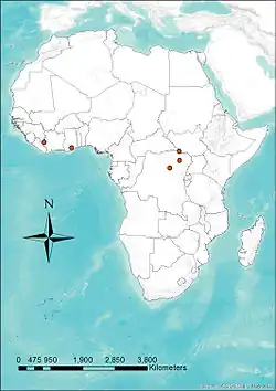 It is found in the Democratic Republic of the Congo, Ivory Coast, Ghana, Equatorial Guinea and South Sudan.[5] Its natural habitats are subtropical or tropical moist lowland and dry forests.